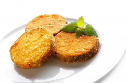 Rezine prvo poprašite z moko, potegnite skozi stepeno jajce in na koncu povaljajte v drobtinah. V vročem olju jih pecite do zlato rumene barve, približno 5 minut na vsaki strani.