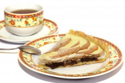 Hruške prerežite na polovico, jim odstranite peščišče, olupite, narežite na trakove in razporedite po kremi.