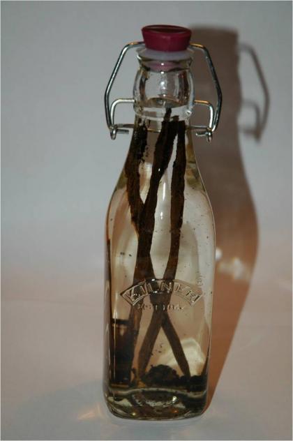 Vaniljeve stroke po dolgem prerežite, jim izpraskajte sredico in oboje denite v stekleničko.