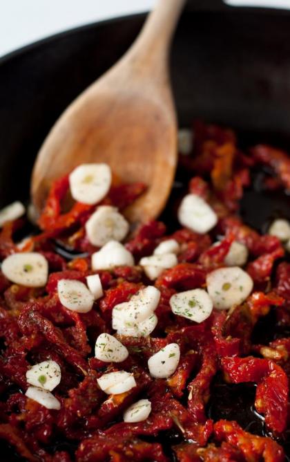 Posušene paradižnike odcedite (olje prihranite) in narežite na trakove. Česen narežite na rezine ali pa drobno sesekljajte.