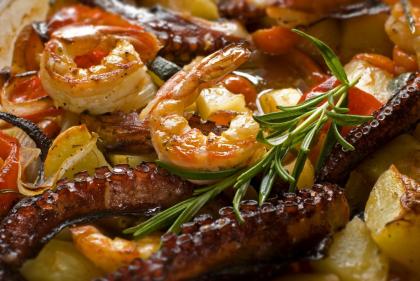 Na mešanico postavite hobotnico (če ste jo predhodno zamrznili, bo mehkejša) in dodajte vejice rožmarina. Dodate lahko tudi zelenjavo in kozice. Pekač pokrijte s folijo in v pečici ogreti na 180 stopinj pecite približno 60 minut.