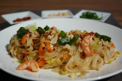 V voku znova segrejte malce olja in na njem popecite odcejene riževe rezance. Zalijte jih s približno 1/3 omake in pustite, da se omaka vpije. Poskusite, če so že dovolj kuhani in če niso dodajte še drugo tretjino omake ter zopet pustite, da jo vpijejo. Nato dodajte mešanico zelenjave in rakcev ter vse skupaj segrejte. Mešanico porinite ob rob, v prosto na dno pa zlijte stepeni jajci. Malce popecite, obrnite in zmešajte z rezanci in zelenjavo. Zalijte s preostalo omako in takoj ponudite.
