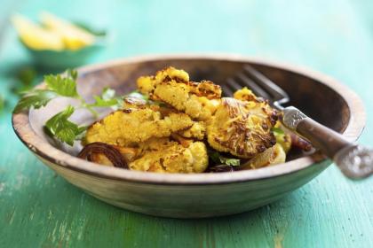 Segrejte pečico na 200 stopinj. V ponvi brez dodane maščobe prepražite mleti koriander, kurkumo, kumin (orientalsko kumino) in kajenski poper, da zadišijo.