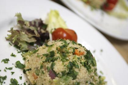 Proseno kašo skuhajte v osoljeni vodi po navodilu na embalaži. Kašo odcedite in ohladite. Čebulo in česen olupite in sesekljajte. Bučke operite, očistite in narežite na kolobarje. Paradižnike iz pločevinke odcedite in narežite na kocke. Sveže paradižnike prelijte z vrelo vodo, olupite, jim odstranite semenje ter narežite na kocke.