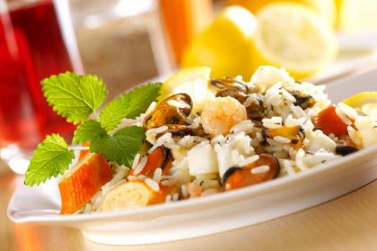 V širši posodi segrejte oljčno olje in na njem do suhega podušite morske sadeže. Dodajte sesekljan česen in riž, prepražite in zalijte z vinom.